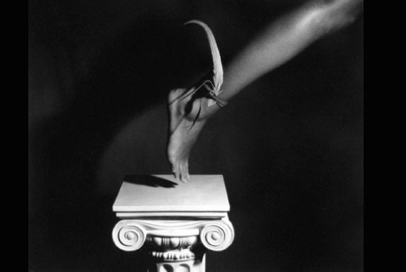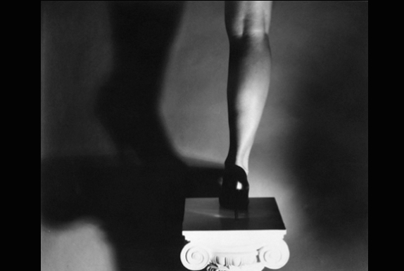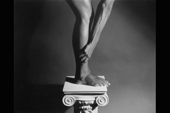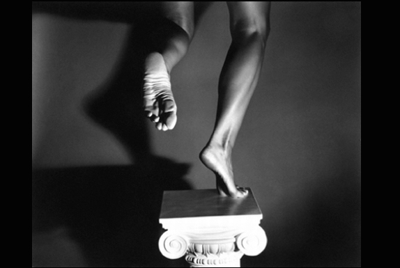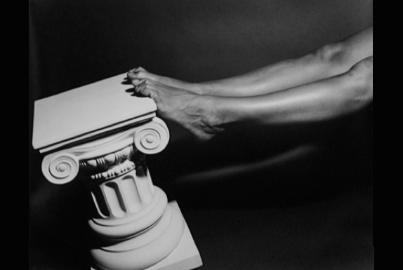 Mr. Gimpaya places his disembodied limbs, singly and in pairs, on pedestals -- white ones topped with Ionic capitals yet -- and, to mock the well-worn fantasy further, he sometimes encases the feet in shiny black pumps with stiletto heels. Whether these legs stand at attention or make as if to flee the scene (one of them aided by a feather attached to the ankle) there is always the feeling that their owner is thinking about chores to be done. They may be on a pedestal, but they are working legs, strong, stubby and capable of delivering a swift kick if necessary. Mr. Gimpaya tips his hat to feminism with these pictures, but he remains very much the Surrealist-in-a-closet.